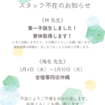 📢お知らせ こんにちは!レフア上北沢整体院です! 3月のスタッフ不在のお知らせです。 林先生 3月より育休に入ります! 復帰の時期は近くなりましたらお知らせ致します。 新米パパ頑張りますので、どうぞよろし […]